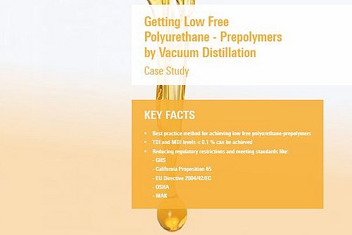 Polyurethane-prepolymers are used to make a variety of materials and products, including foams, glues and hot melts, gaskets, coatings and solid rubber. Prepolymers are made by reacting polyols with isocyanates. Isocyanates are a group of highly reactive chemicals characterised by the presence of an isocyanate group (–N=C=O). Some isocyanates such as toluene diisocyanate (TDI), are considered highly hazardous and toxic. After reaction, the isocyanate levels in the product are excessive. To achieve a safe and competitive product that meets international regulations, this excess must be removed.