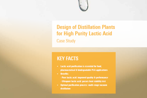 Lactic acid purification is essential for food, pharmaceutical and biodegradable PLA applications as pure lactic acid shows improved quality and performance, while ultra-pure lactic acid even passes the heat stability test required for many applications. The optimal lactic acid purification process is multi-stage vacuum distillation.