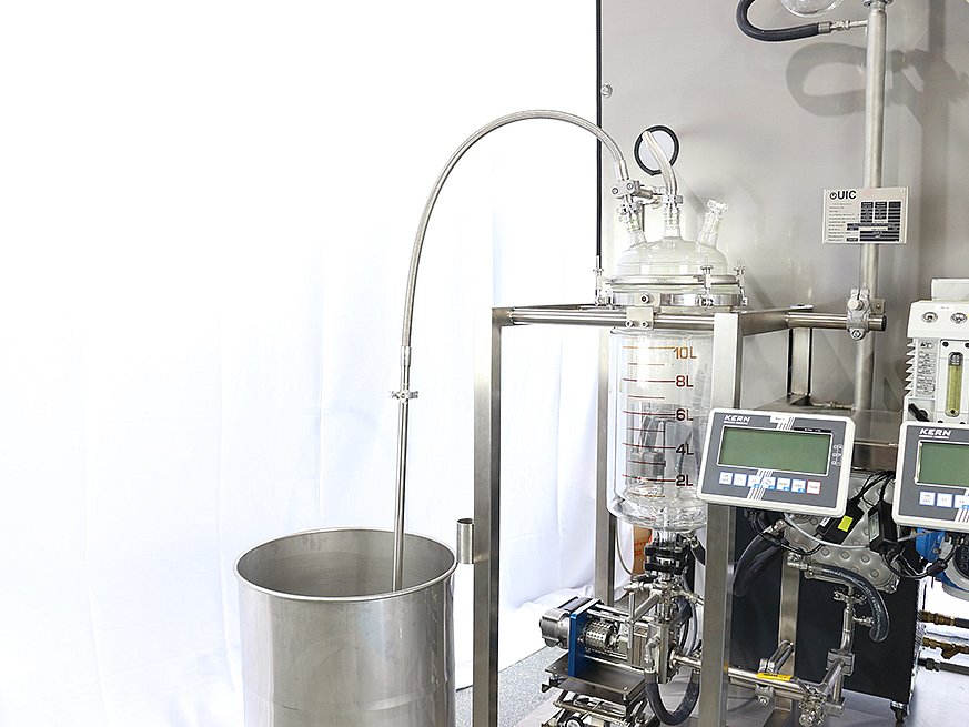 Kurzwegdestillation in einer Pilotanlage aus Edelstahl mit 0,06 m2 gewischter Beheizungsfläche.